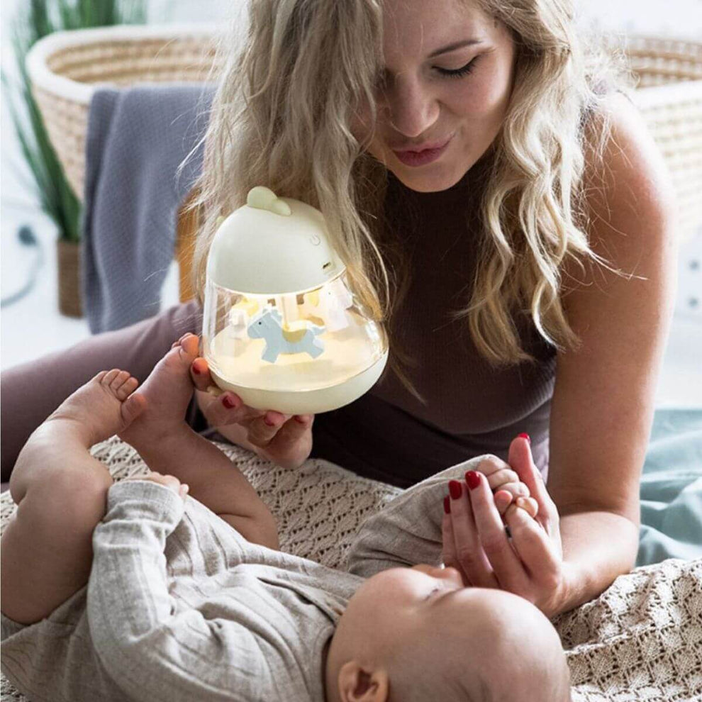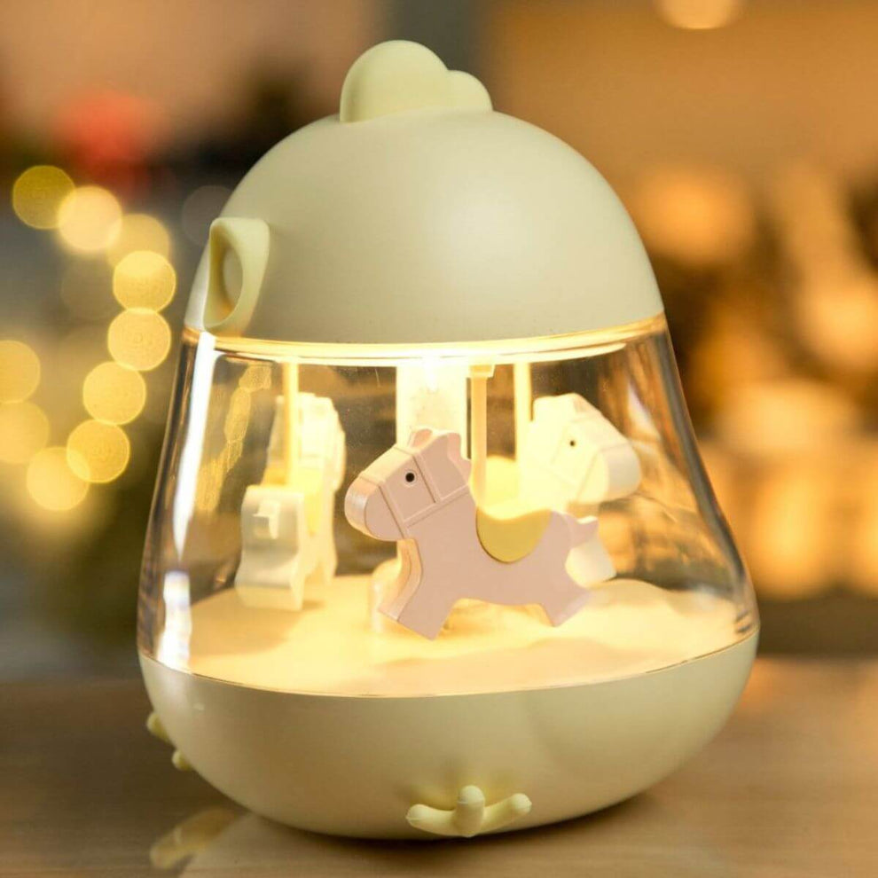 Esta adorable caja de música con forma de carrusel también funciona como luz nocturna, ofreciendo una compañía relajante día y noche.