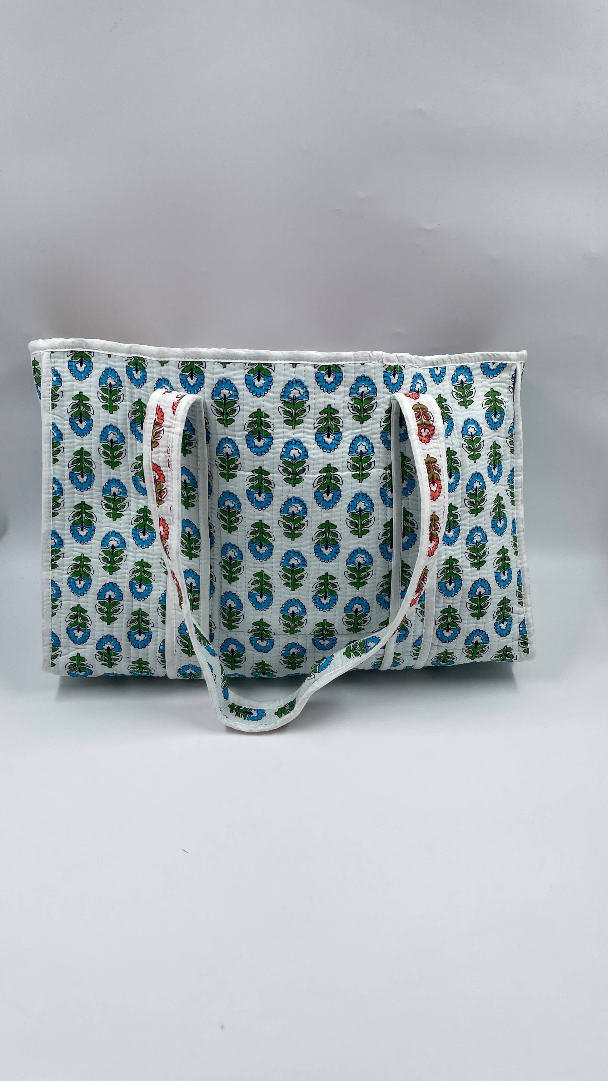 Handmade Cotton Reversible Quilted Jaipur Bag - White and Blue Pansies Flowers